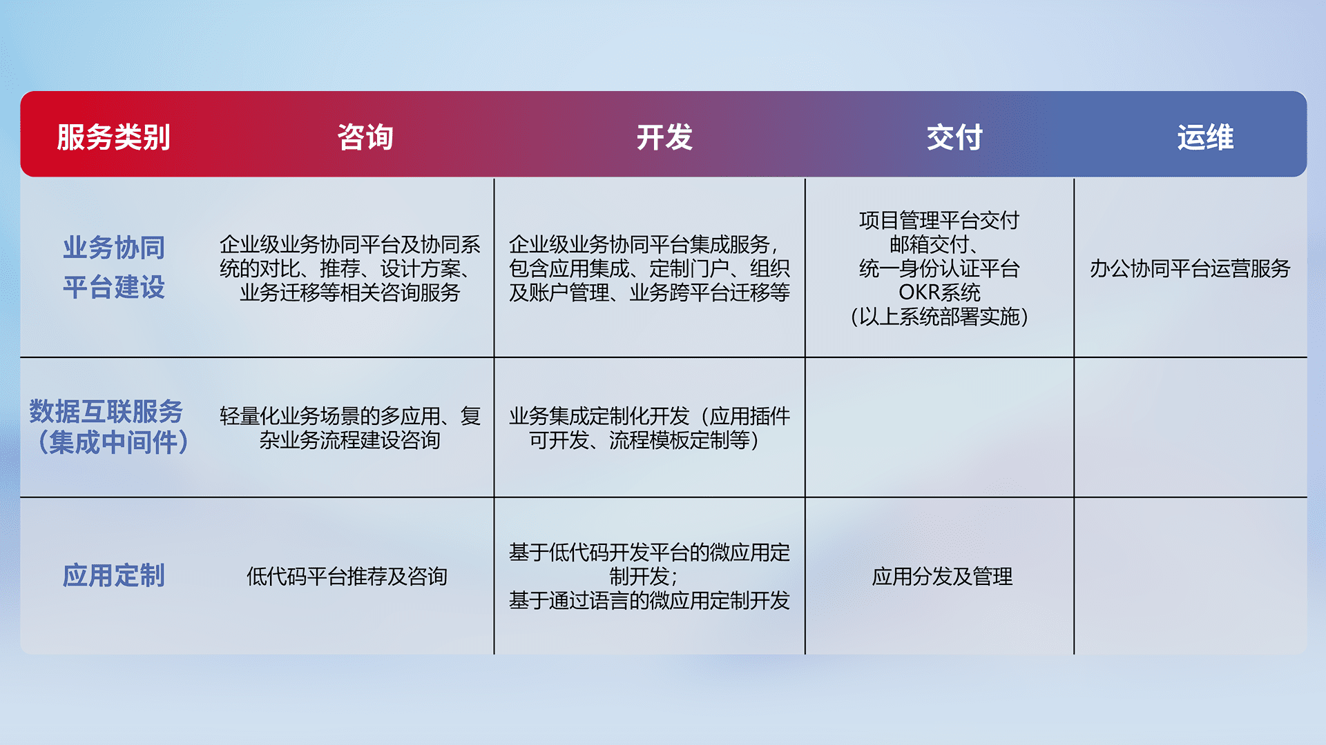 针对钉钉、、、、企微、、IDaas等平台级产品提供产品的规划、、、方案、、、交付、、、定制化开发等服务,,,,实现如统一协同办公、、智能客户服务、、、混合会议管理、、、智能数据查询、、、等业务场景,,实现数字化转型。。